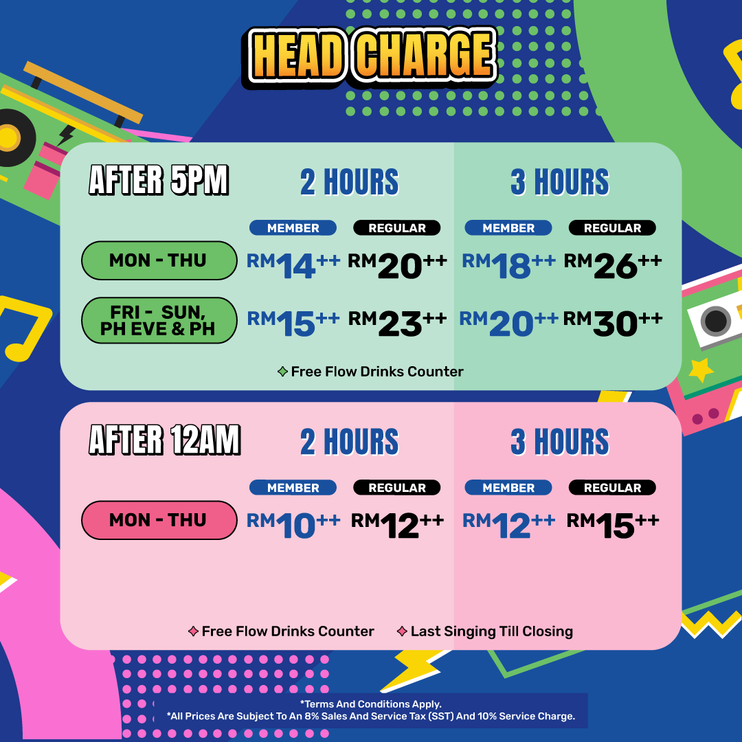 f) Subject to a 10% service charge. A 6% SST applies to food and non-alcoholic beverages, while an 8% SST applies to all other items, including but not limited to alcoholic beverages, head charges, and bundle sets. - Early K Session is available from 11 AM until 1 PM. Session duration is based on the selected package (2-hour or 3-hour). The latest session end time is 3 PM.