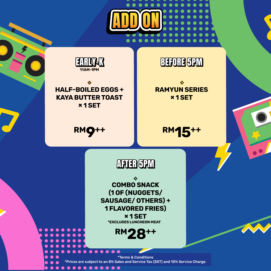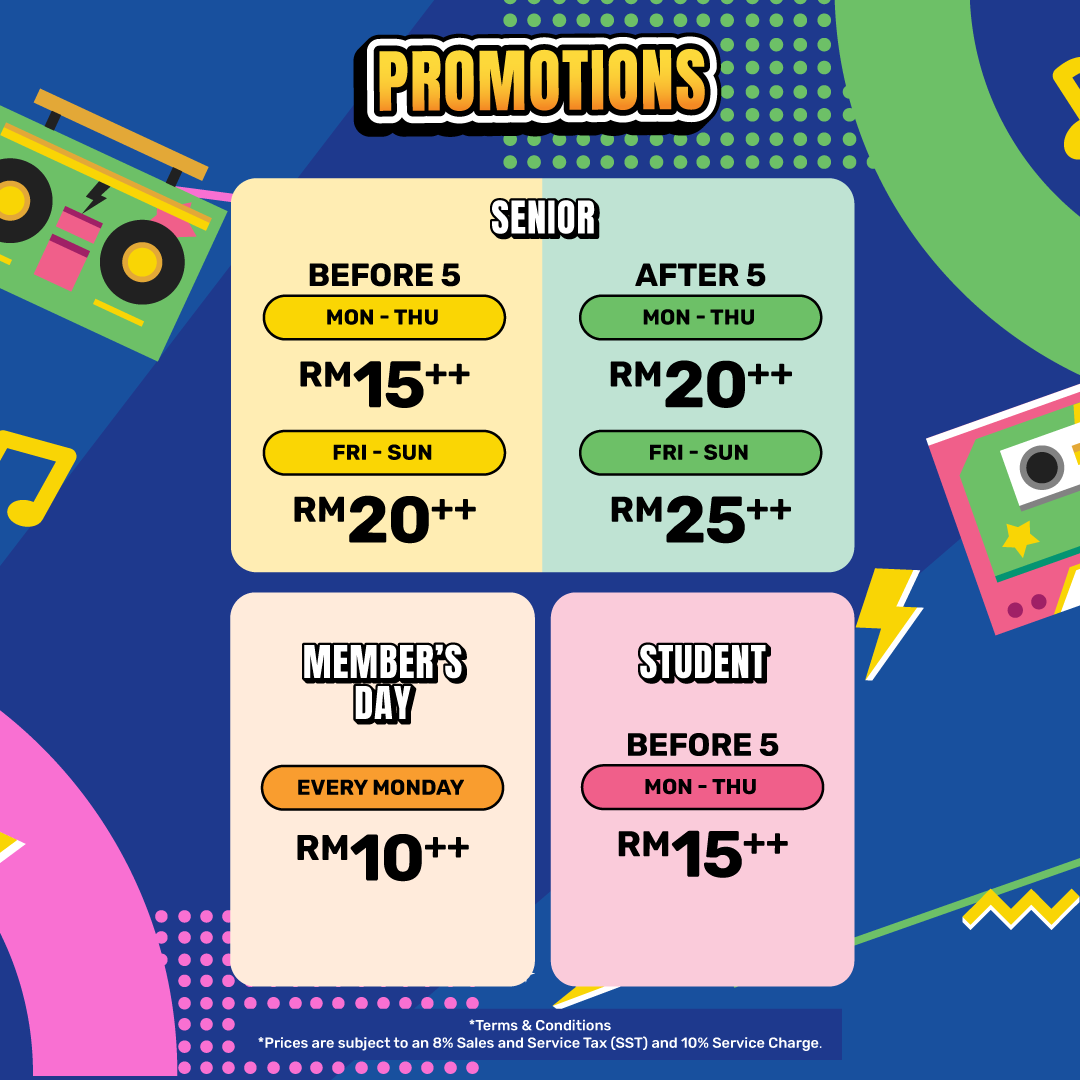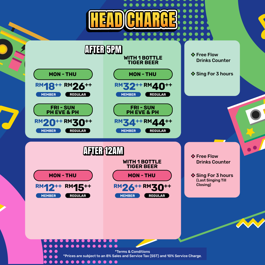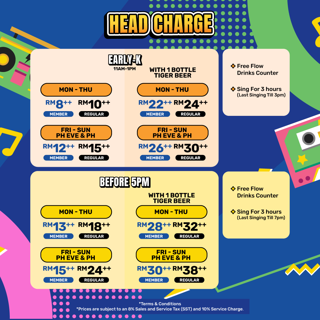 f) Subject to a 10% service charge. A 6% SST applies to food and non-alcoholic beverages, while an 8% SST applies to all other items, including but not limited to alcoholic beverages, head charges, and bundle sets. - Early K Session is available from the outlet’s opening time until 1 PM, offering up to 3 hours of singing. The maximum singing time is until 3 PM.