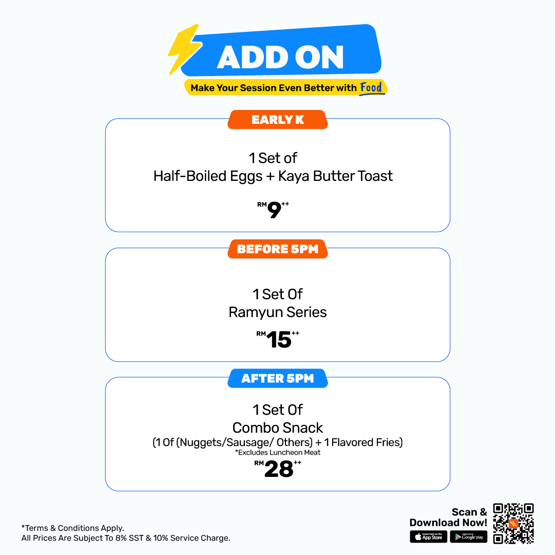 f) Subject to a 10% service charge. A 6% SST applies to food and non-alcoholic beverages, while an 8% SST applies to all other items, including but not limited to alcoholic beverages, head charges, and bundle sets. - Early K Session: