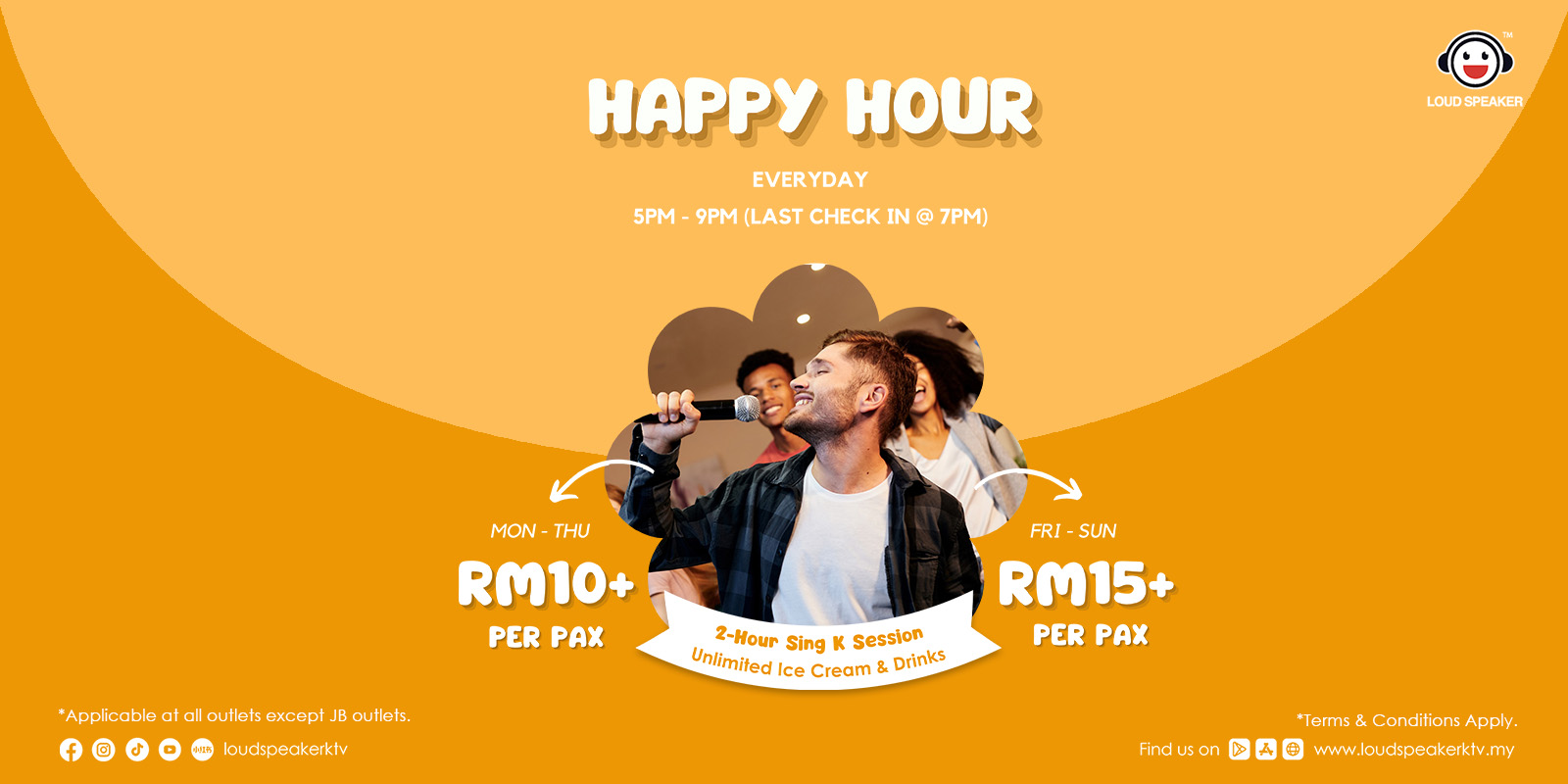 1. Upon check-in during Happy Hour promotion period, customers are entitled to a session with a maximum sing time of 2 hours depending on the time set by the outlet. The duration of this session and the final sing time are subject to the predefined schedule of each outlet, as determined and informed at the time of check-in.