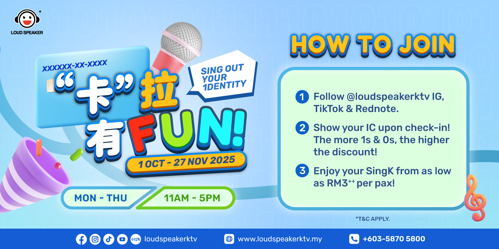 🎤 Start your day with SingK from just RM3++ at Loud Speaker❗Show your IC 🪪 upon check-in & unlock this #EXCLUSIVE deal with 1s & 0s 💥