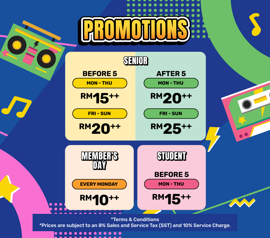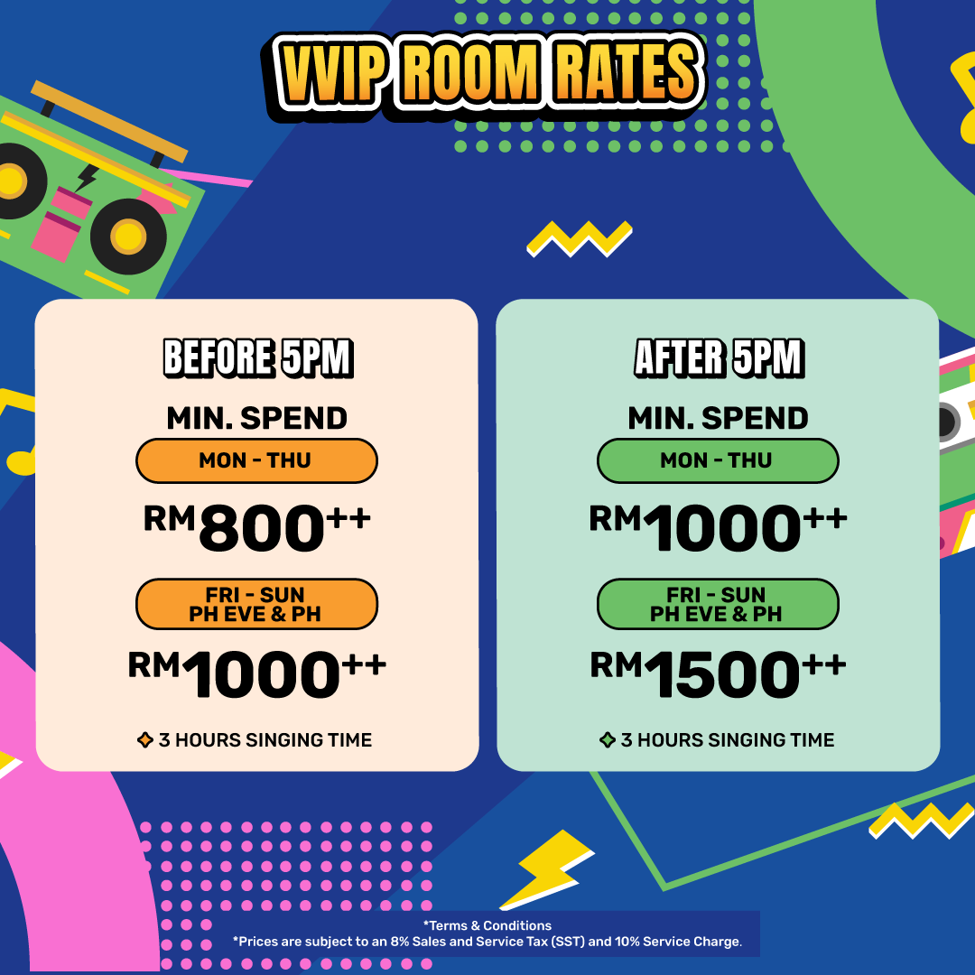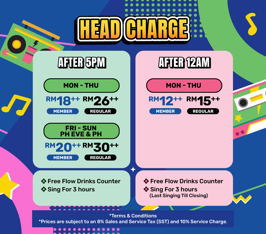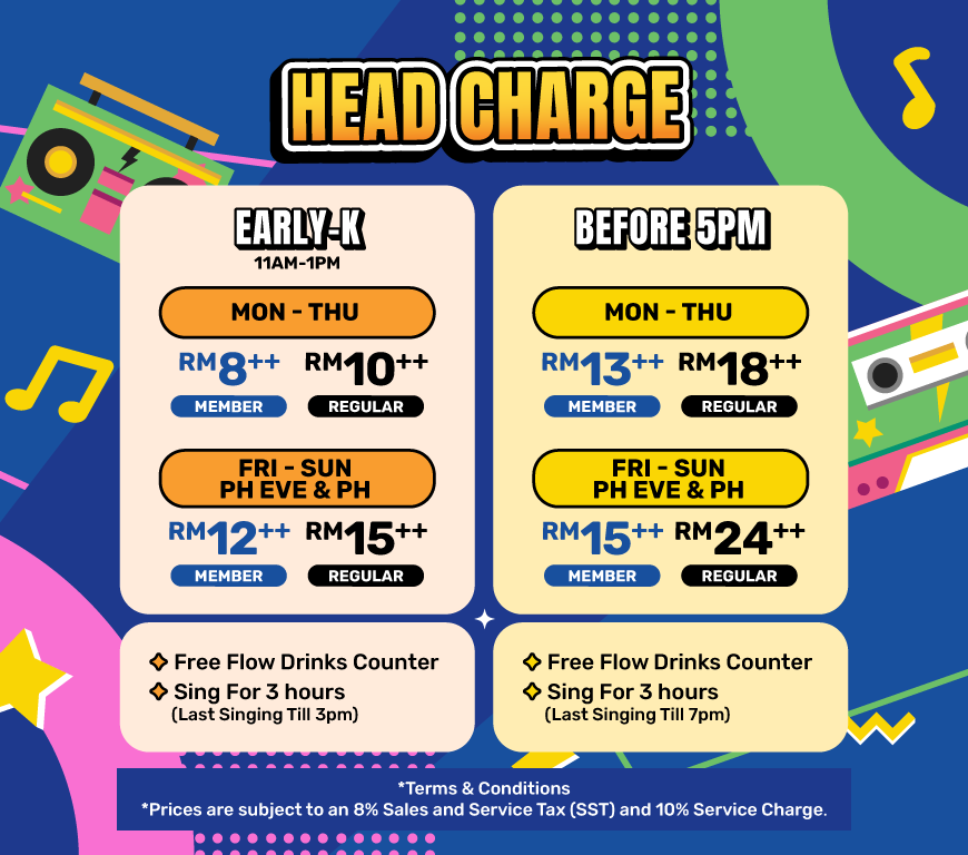 f) Subject to a 10% service charge. A 6% SST applies to food and non-alcoholic beverages, while an 8% SST applies to all other items, including but not limited to alcoholic beverages, head charges, and bundle sets. - Early K Session is available from the outlet’s opening time until 1 PM, offering up to 3 hours of singing. The maximum singing time is until 3 PM.